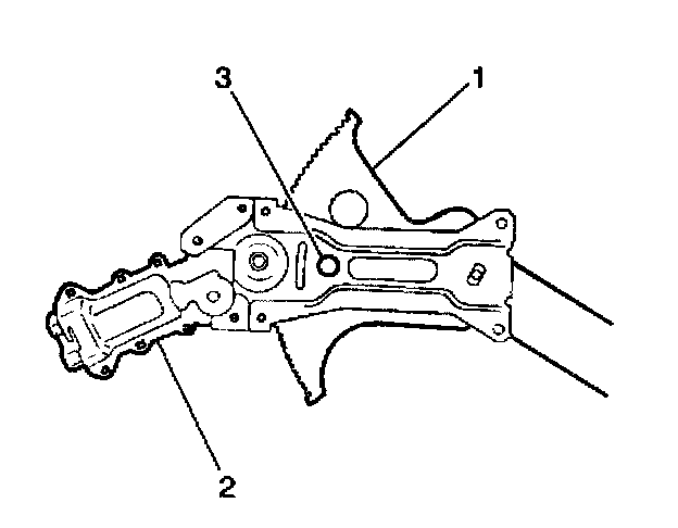 2. Drill hole (3) through window regulator sector gear and backplate.