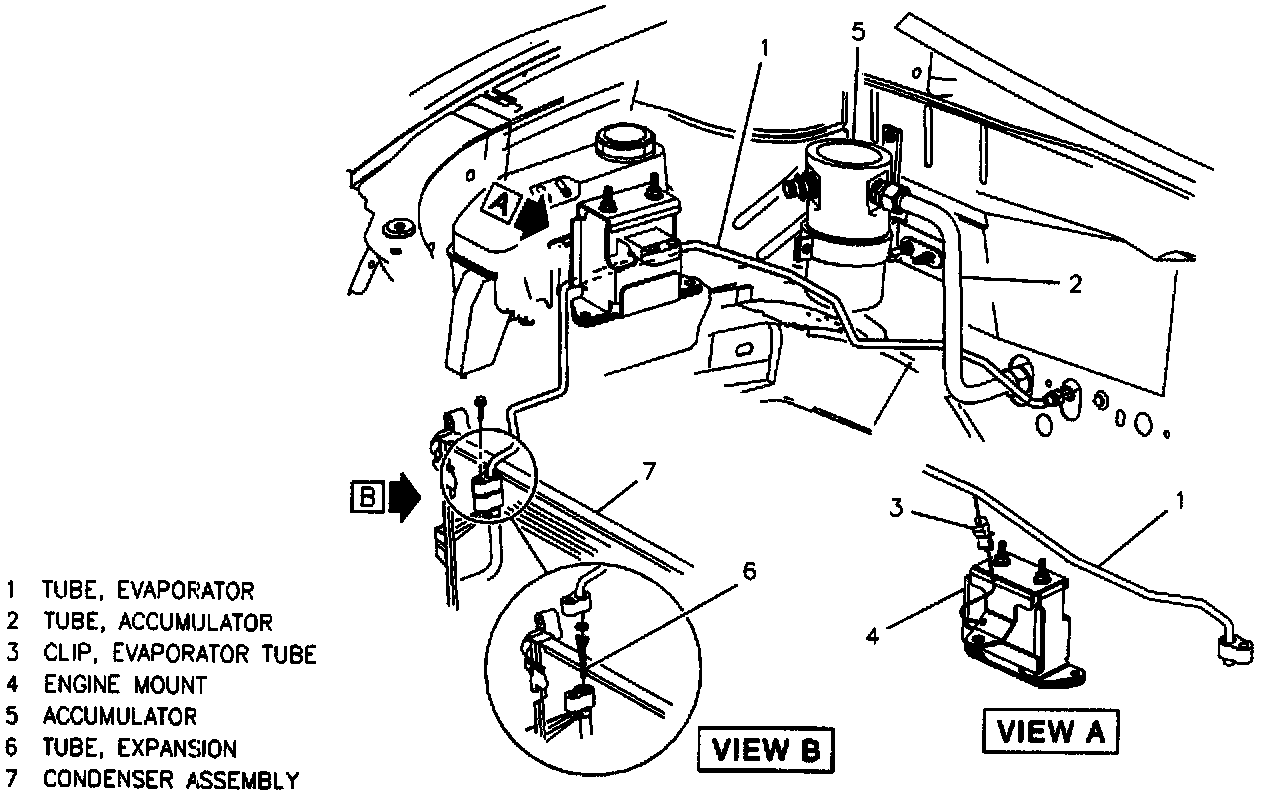 The expansion tube (orifice) is located at the condenser to evaporator line connection in the condenser.