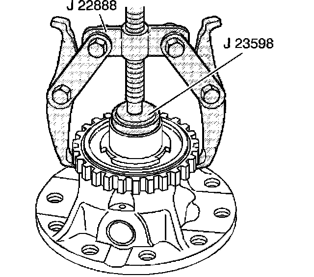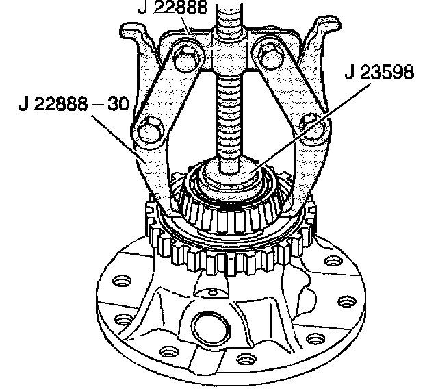 1. Remove the left differential side bearing using the J 22888, the J 22888-30 and the J 23598/J 2241-11.