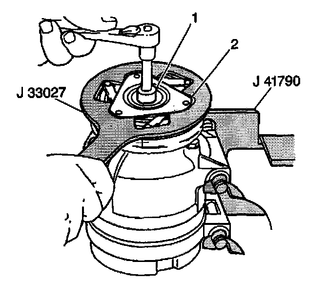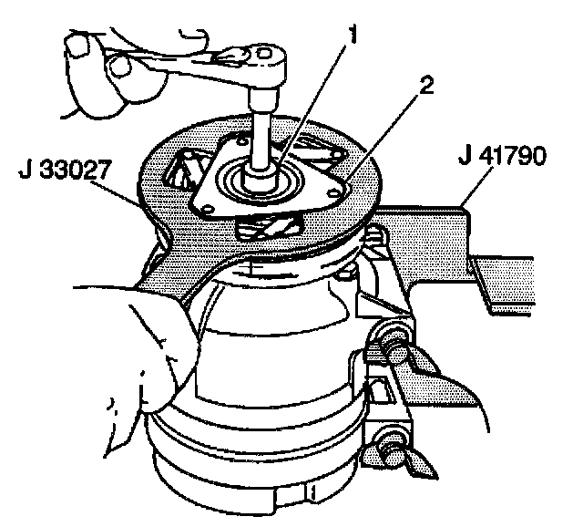 11. Hold the clutch plate and hub assembly (2) with the J 33027-A.