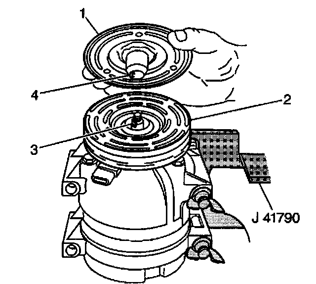 3. Align the shaft key with the shaft keyway in the clutch plate and the hub assembly and place onto the compressor shaft (3).