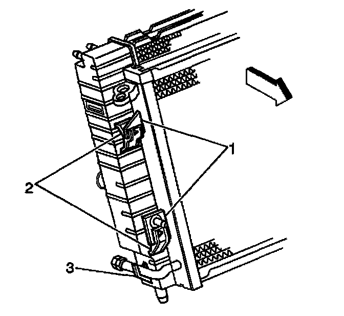 11. Carefully raise the condenser along the radiator just enough to release the condenser tabs (1) from the radiator slots (2) and the condenser tube from the tube retainer (3).