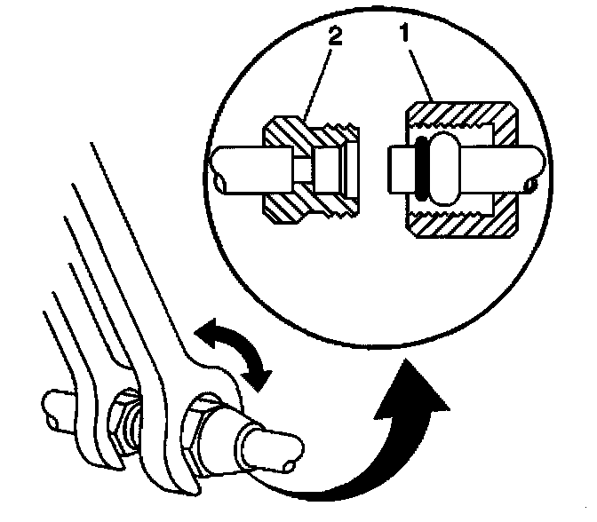 13. Using a back-up wrench on the condenser fitting (2), secure the compressor hose fitting (1) to the condenser.