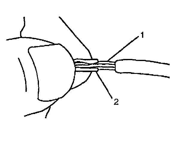 7. Center the splice clip (2) over the stripped wires (1) and hold the clip in place.