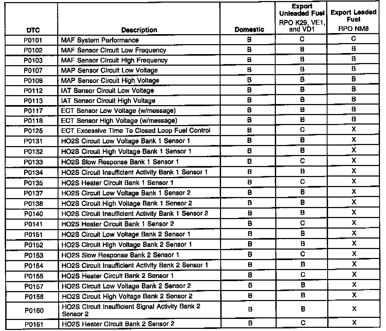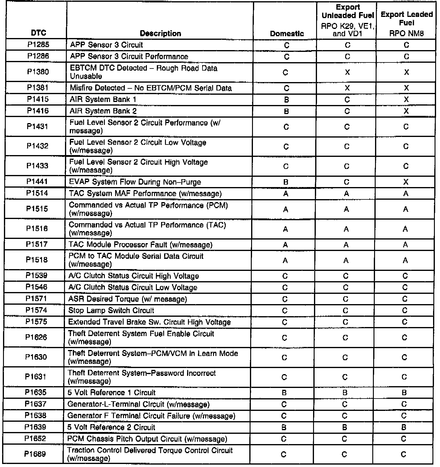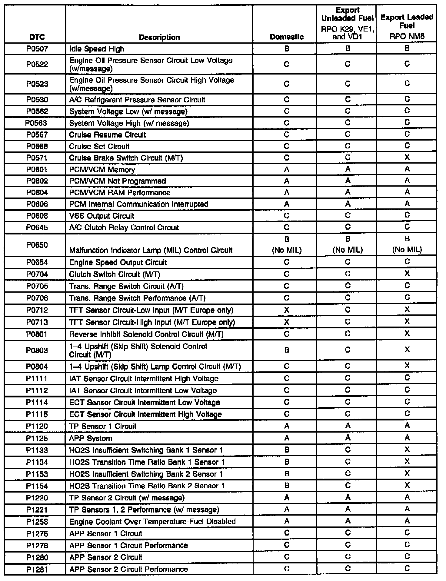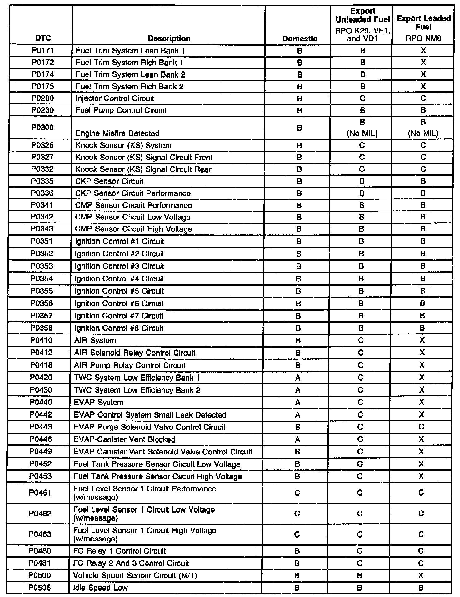 The service information contained in this manual refers to the Federal calibration package. The export change is NOT reflected in the service information on the DTC's diagnostic support information page or in the Repair Instructions. The DTC Type table information refers to domestic and Export calibration packages. Export vehicles may have differences in DTC types that will affect Malfunction Indicator Lamp (MIL) operation. Certain DTCs have been changed from type A to type C or, in some cases, type x. When a type A diagnostic fails, a DTC is set immediately and the Malfunction Indicator Lamp (MIL) is illuminated. When a type B DTC diagnostic fails, the Malfunction Indicator Lamp (MIL) will illuminate if the fault is present after two consecutive drive trips. A type C DTC will set after one failure and be stored in history but will not illuminate the Malfunction Indicator Lamp (MIL). For certain DTCs, a message will also appear on the Driver Information Center (DIC).