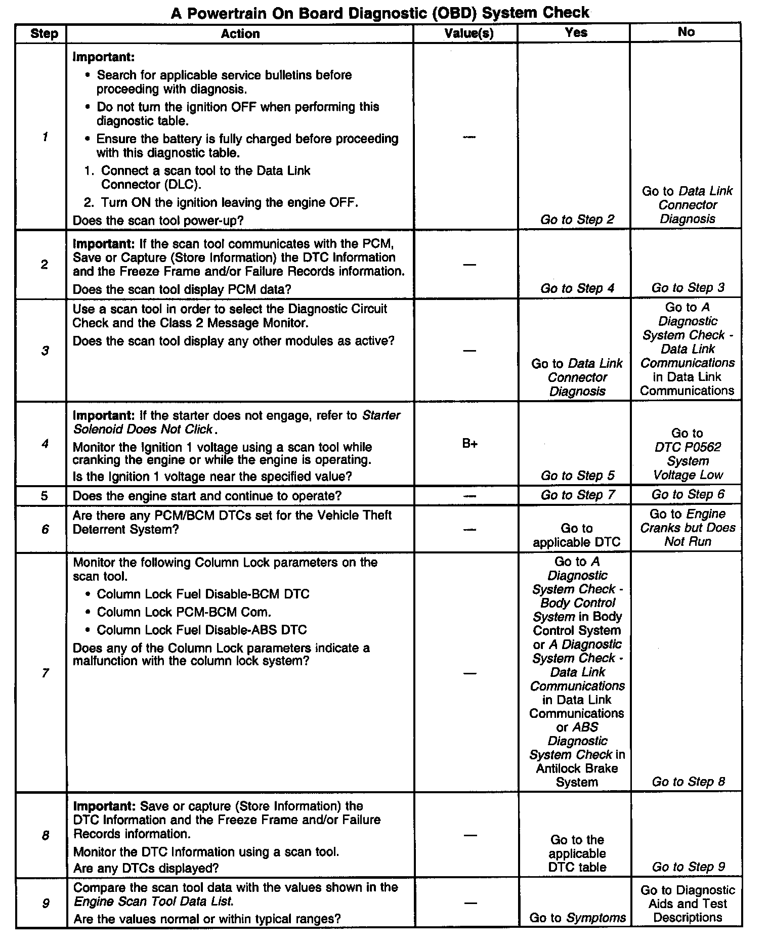 The Powertrain OBD System Check is an organized approach to identifying a concern created by an electronic engine control system malfunction. The Powertrain OBD System Check is the starting point for any driveability concern diagnosis. The Powertrain OBD System Check directs the service technician to the next logical step in diagnosing a concern. Understanding and using the table correctly will reduce the diagnostic time and prevent the replacement of good parts.