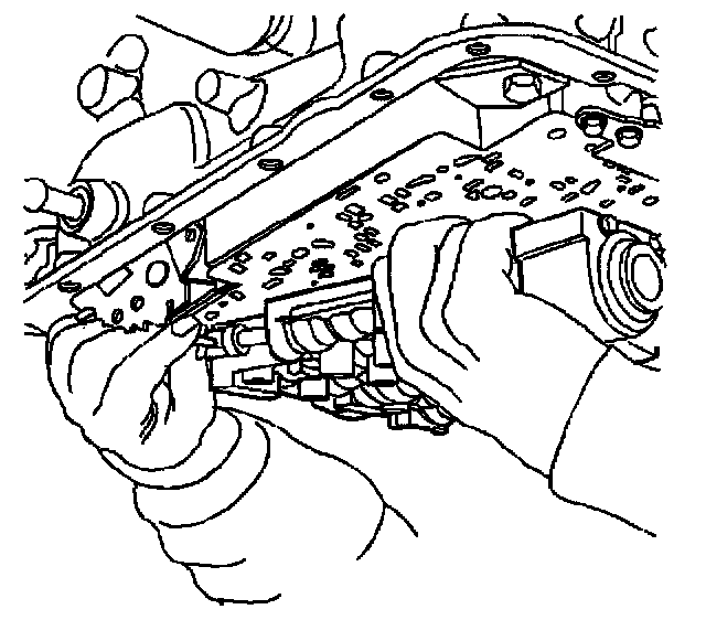 15. Carefully begin to lower the control valve body down from the transmission case, disconnect the manual valve link, then remove the control valve body from the transmission case.