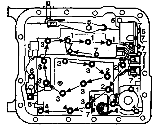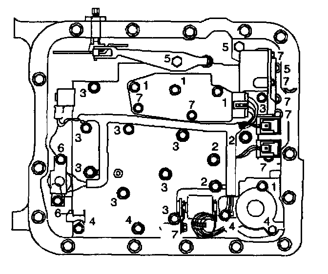 6. Remove the TCC solenoid retaining bolts and the valve body bolts which retain the internal wiring harness.