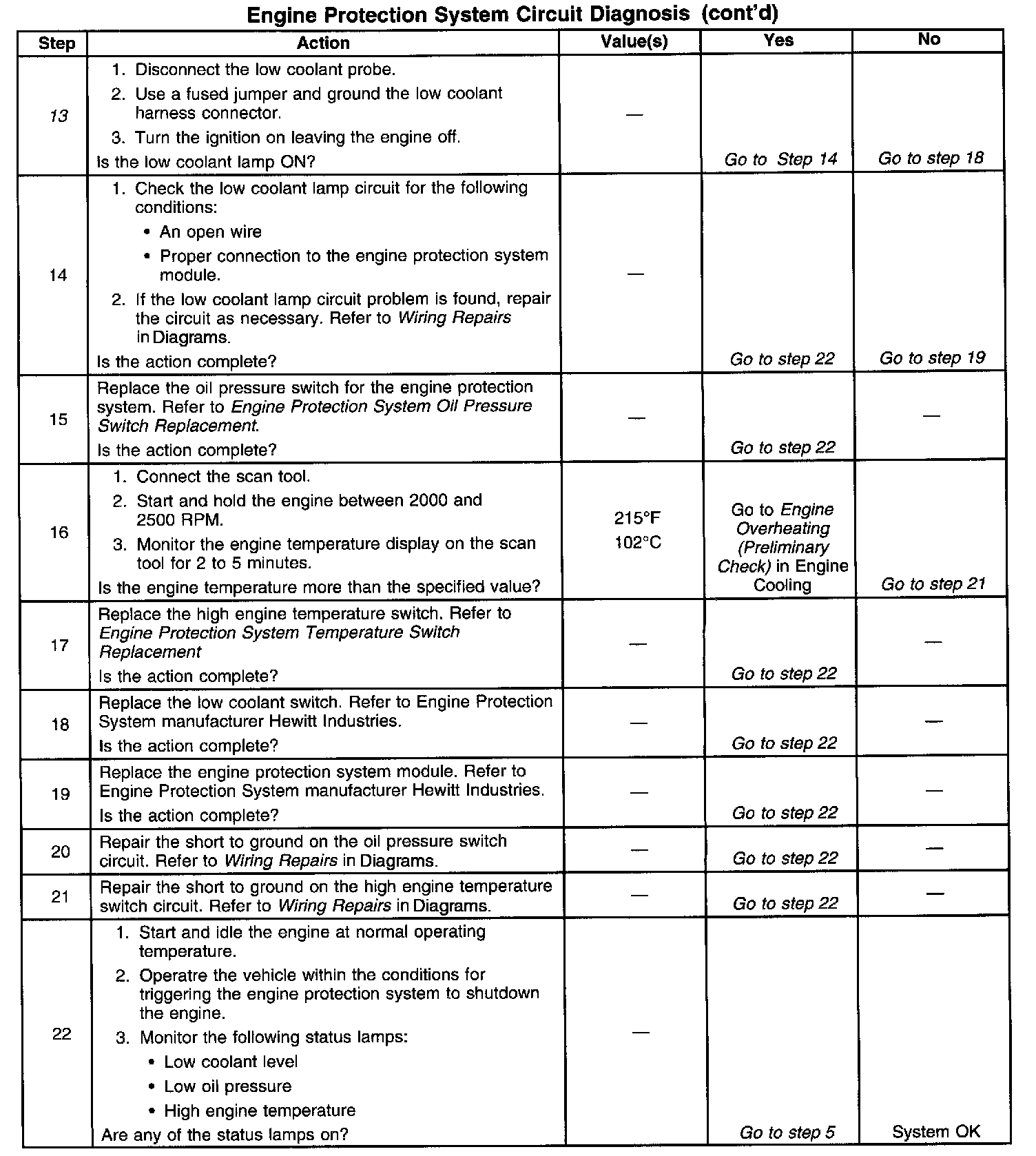 The engine protection system utilizes a separate control module and independent sensors to monitor the oil pressure, coolant temperature and coolant level. With each engine start up, the system self tests with an alarm and light display for 3 seconds. When the engine is started, the alarm and light display will cancel as oil pressure rises. When a malfunction occurs (engine coolant overheat, low coolant level, or low oil pressure), the engine protection module will open the engine shut off solenoid (ESO) located on the injector pump 30 seconds after the condition is detected.