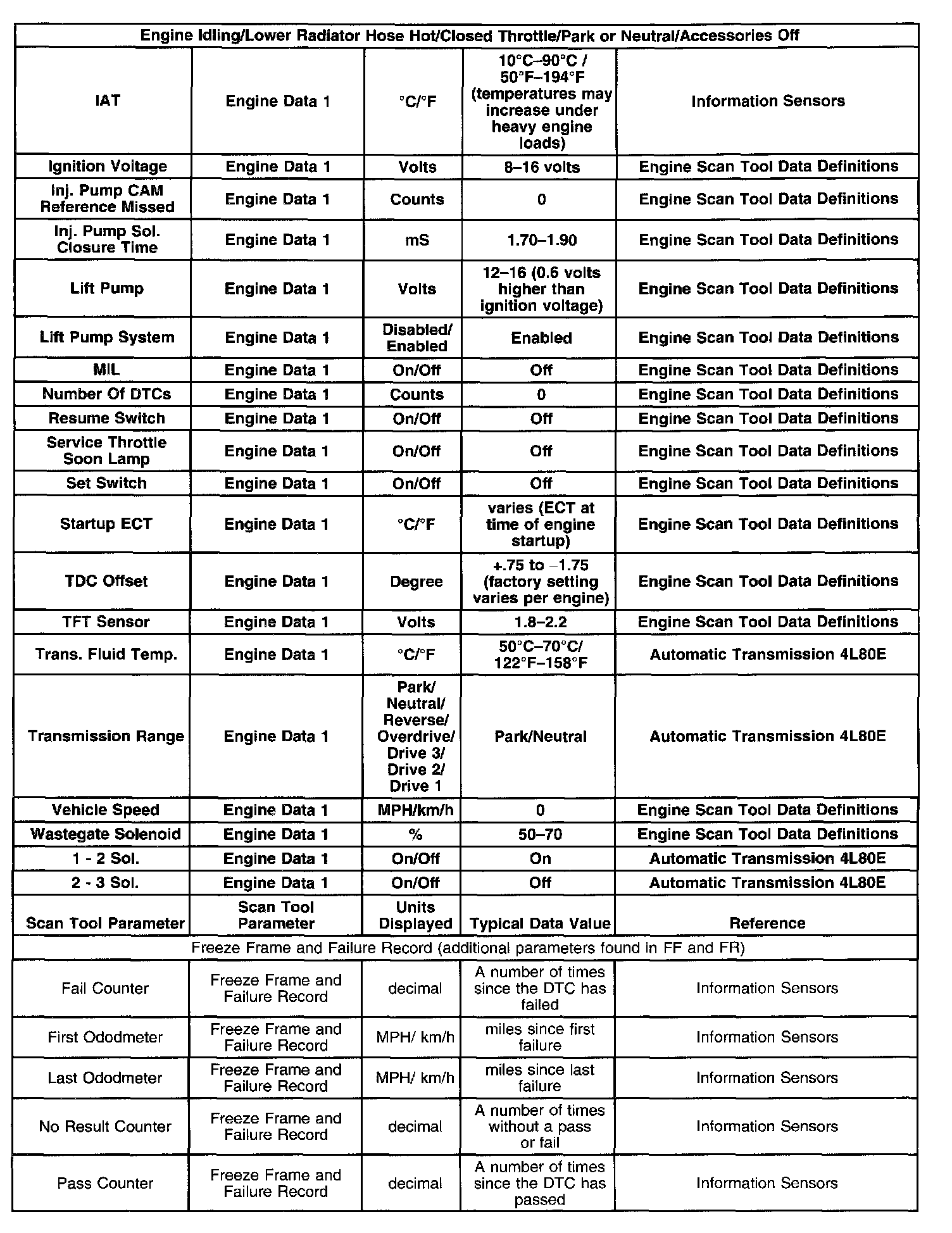 Use only the parameters listed in the tables for diagnosis If a scan tool reads other parameters, the values are not recommended by General Motors for use in diagnosis. For more description on the values and the use of the scan tool diagnosis the PCM inputs, refer to the applicable diagnosis. If all values are within the range illustrated, refer to Driveability Symptoms.