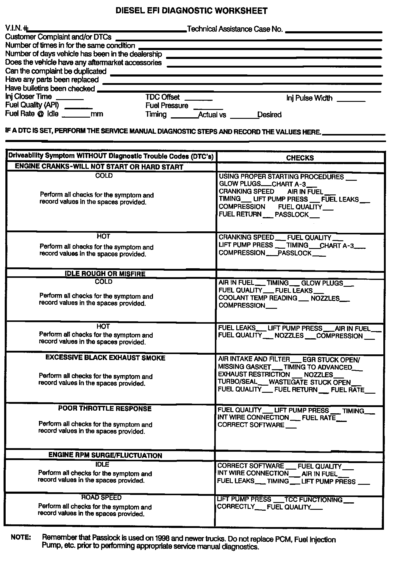 1. Prior to removal and request of an injection pump, perform diagnostics, based on symptom. Follow the latest version of the Diesel Diagnostic Section in the Service Manual and utilize the Diesel EFI Diagnostic Worksheet (Attachment 1).