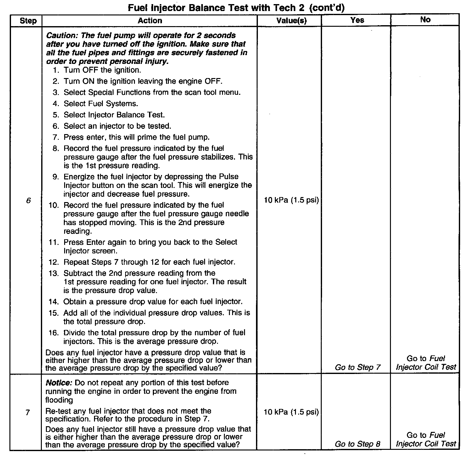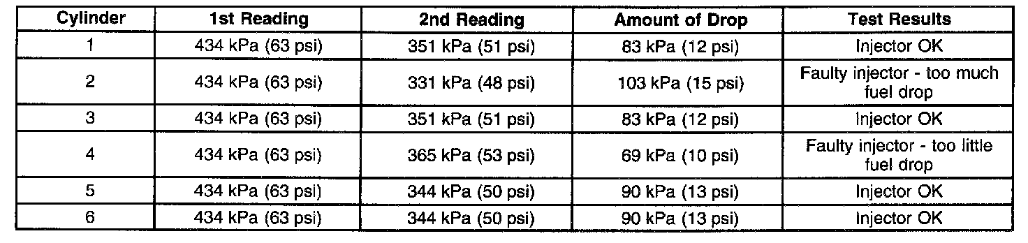 Test Results: Combine all of the injector pressure drops and divide this number by the amount of injectors available. This is the average pressure drop. Each individual injectors pressure drop value must be within 10 kPa (1.5 psi) of the average pressure drop value.