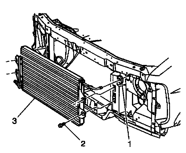 1. Install the condenser (3) and the retaining bolts to the vehicle.