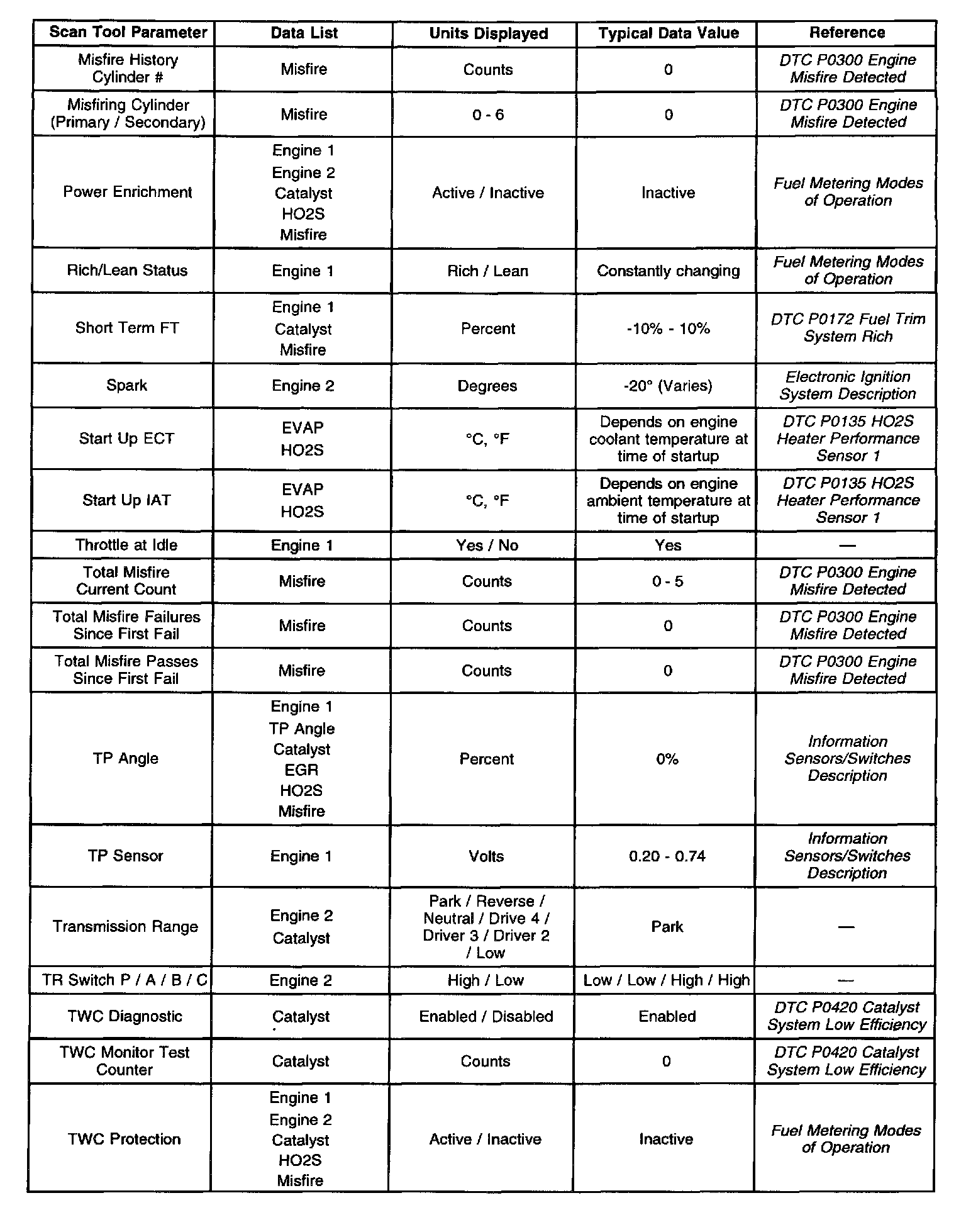 Only the parameters listed below are referred to for use in diagnosis. For further information on using the scan tool to diagnose the PCM and related sensors, refer to the applicable reference listed below. If all values are within the typical range described below, refer to Symptoms for diagnosis. The Typical Scan Data Values table contains all the parameters included in the following data lists arranged in alphabetical order: