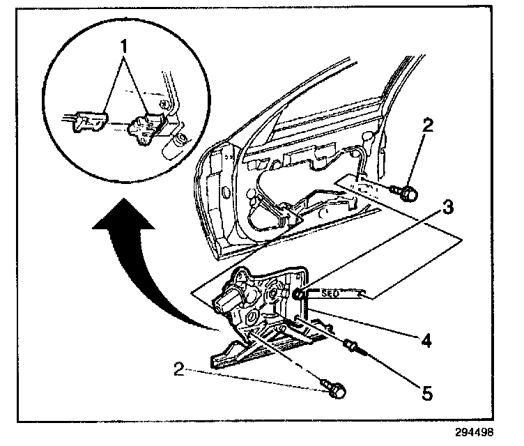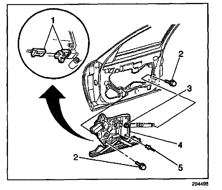 6. Remove the window regulator bolts (2) (power windows).