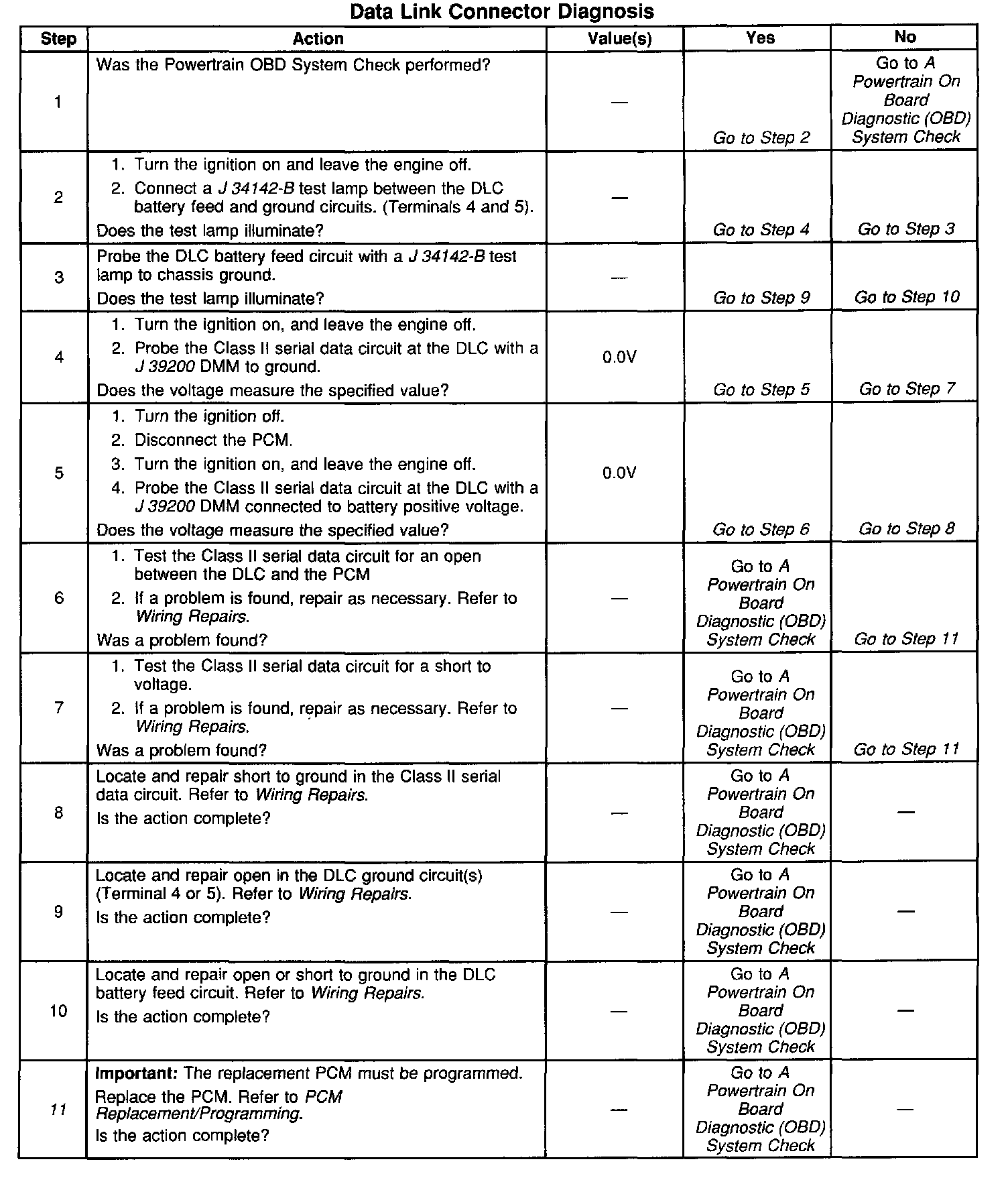 The Class II serial data circuit to the DLC allows bi-directional communication between the PCM and the scan tool. If communication between the scan tool and the PCM cannot be established, the procedure in the DLC Diagnosis table should be used to diagnose the condition.
