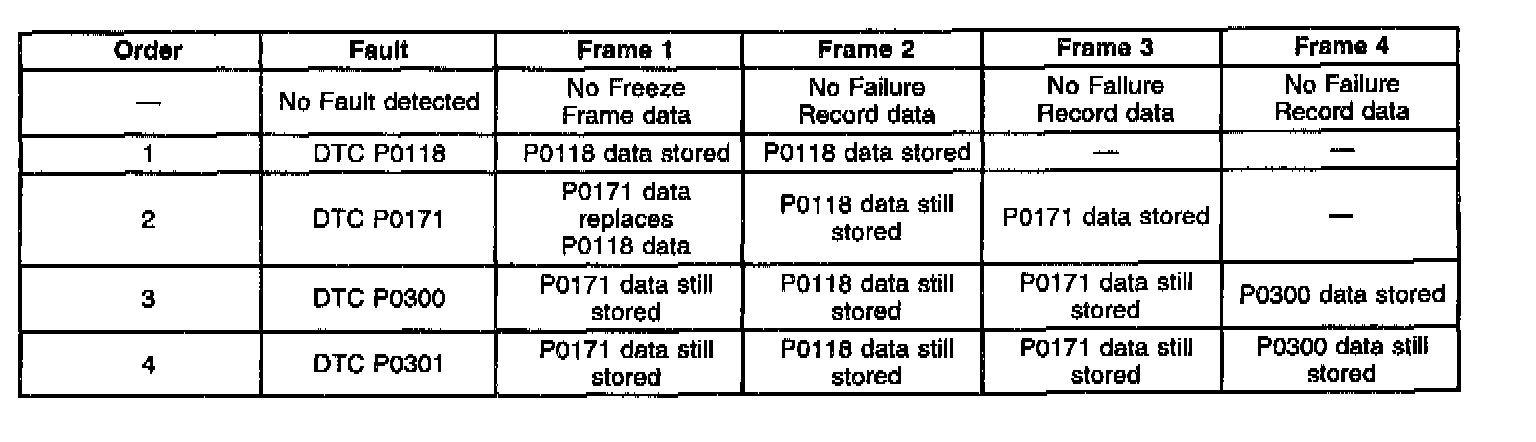 The PCM can store one Freeze Frame and save the recorded data of three additional Freeze Frames as Failure Records. Therefore the PCM can store up to 4 frames of Freeze Frame and Failure Record data. The 1st frame stores data of the fault that was detected first. The data from the 1st detected fault is also stored in the 2nd frame as a Failure Record. The Failure Record data stored in the 2nd frame is permanent, and will not change when a new fault is detected. The 1st frame of Freeze Frame data will remain unchanged unless a fault of a higher priority occurs. A misfire fault (DTC P0300-P0304) or a fuel trim fault (DTC P0171 and P0172) will replace the data in the 1st frame of Freeze Frame data because these DTCs have a higher priority under OBD 2 rules. The 2nd through 4th frames of Failure Records will store fault data in the order that the faults were detected regardless of the fault's priority. Utilizing the 4 frames of Freeze Frame and Failure Record data can provide information on the order in which the faults were first detected. The following table indicates how Freeze Frame and Failure Record data is stored when two or more faults are detected.