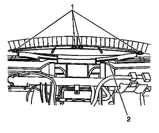 8. Install the air distribution center duct (1) to the instrument panel. Secure the center duct with the screw (2).