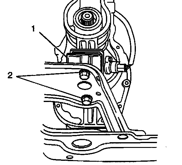 4. Install the 2 bolts (2) into the right transmission-to-engine reinforcement brace (1).