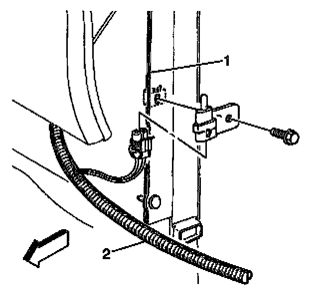 The radiator support flange (1) mounts the ambient outside air temperature sensor near the radiator baffle. A 2-wire weather pack electrical connector attaches the ambient outside air temperature sensor to the forward lamp harness (2). In order to service the ambient outside air temperature sensor, perform the following steps: