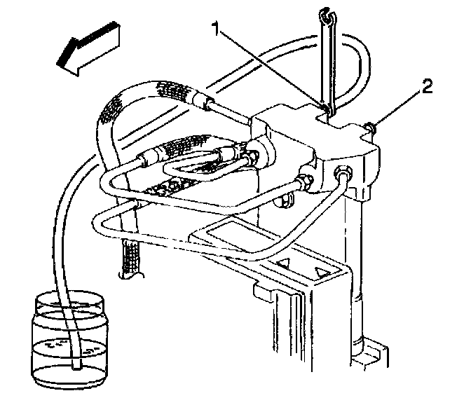 10. Install the clear plastic bleeder hose to the ABS modulator FRONT bleeder valve (2).