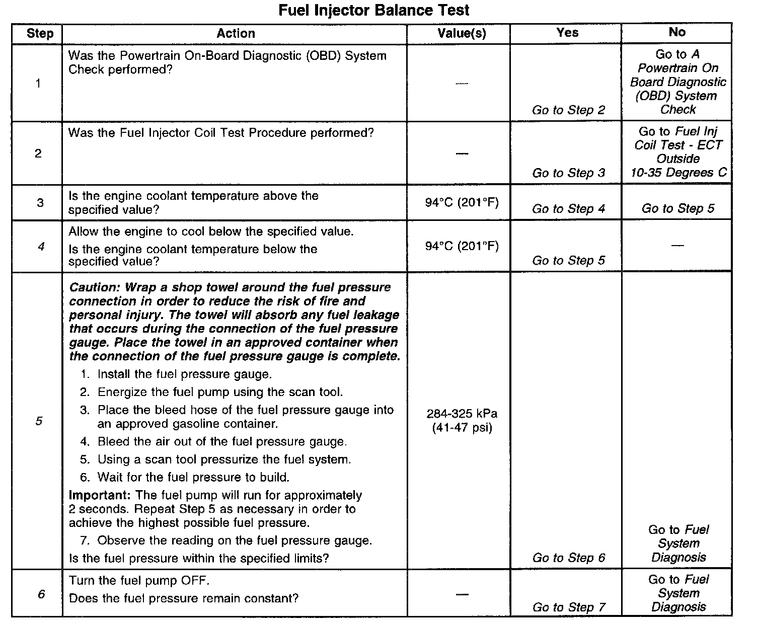 5. The fuel pressure should be within the specified range. If the fuel pressure is not within the specified range, go to Fuel System Diagnosis. Component Tests and General Diagnostics