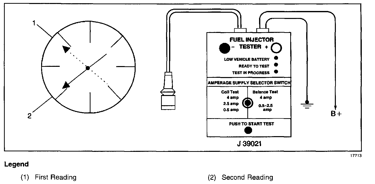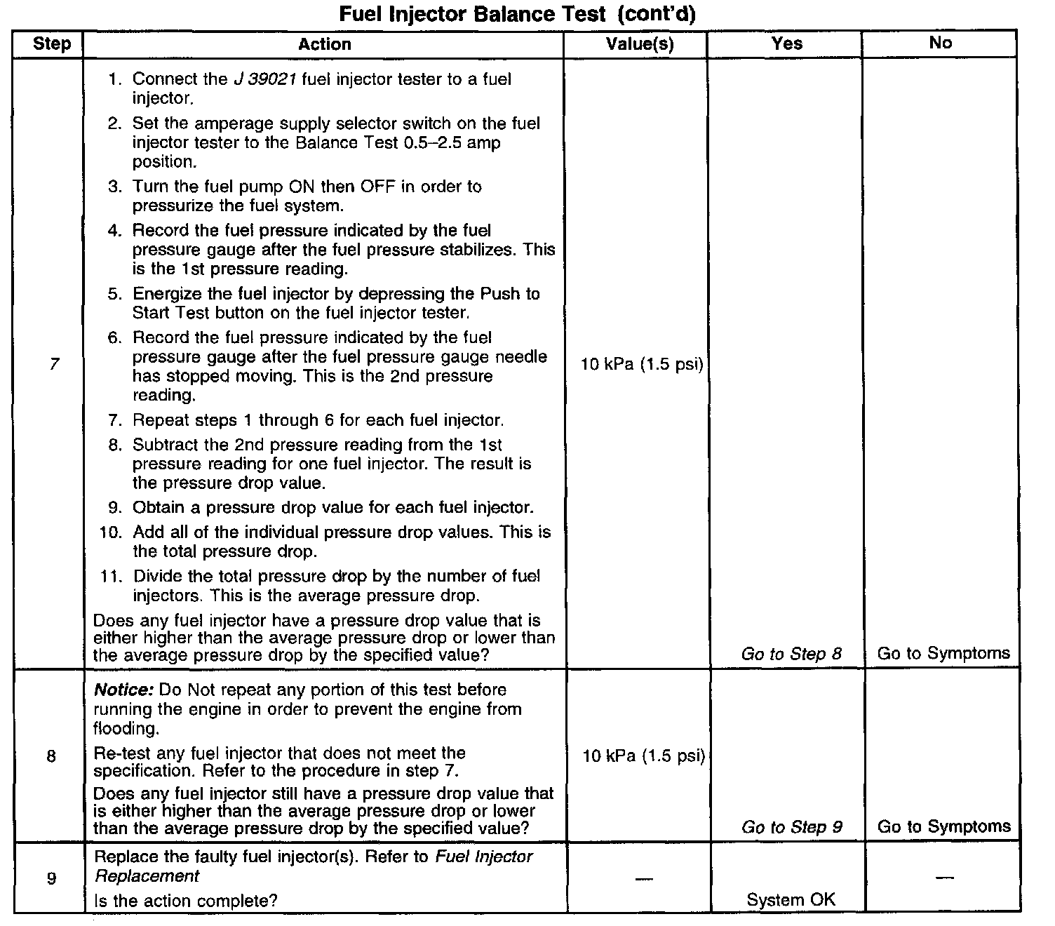 7. If the pressure drop value for each fuel injector is within 10 kPa (1.5 psi) of the average pressure drop value, the fuel injectors are flowing properly. Calculate the pressure drop value for each fuel injector by subtracting the second pressure reading from the first pressure reading. Refer to the Injector Balance Test Example.