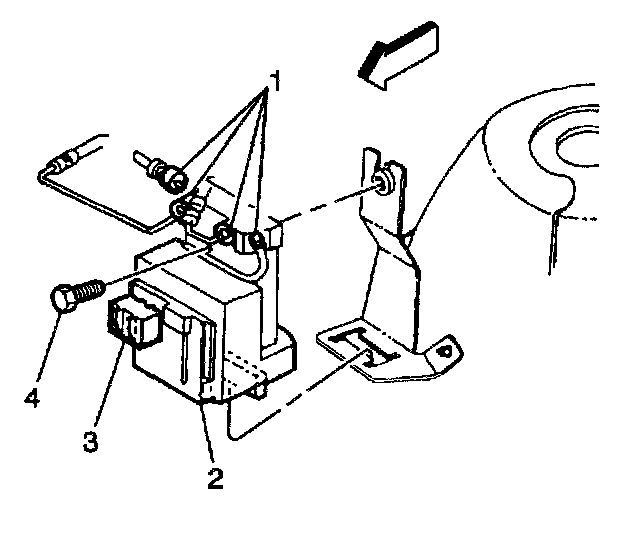 3. Remove the bolt (4) attaching the TCS hydraulic modulator/motor pack assembly (2) to the mounting bracket.