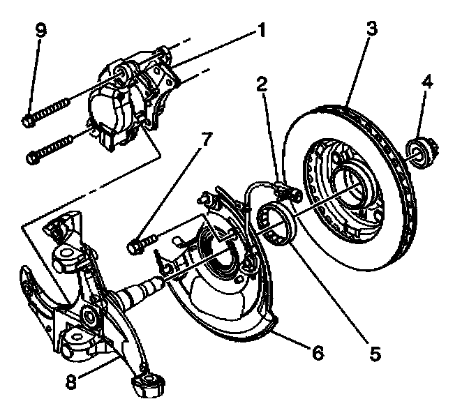 10. Remove wheel speed sensor and splash shield assembly (6). Remove splash shield gasket. Clean gasket and knuckle (8) surfaces thoroughly with a dry cloth.