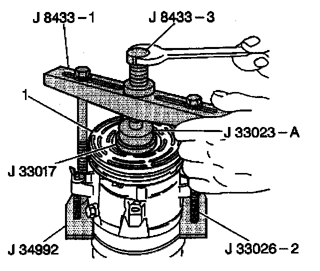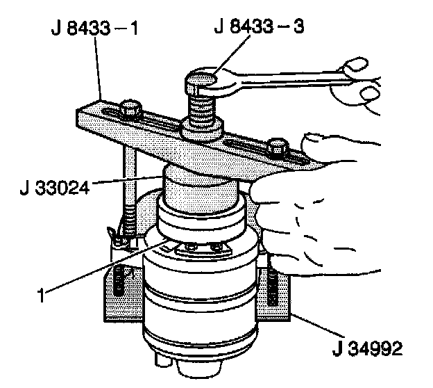 8. Turn the center forcing screw of the J 8433-1 in order to force the clutch coil onto the front head. Ensure that the clutch coil and the J 33024 remain aligned during installation.