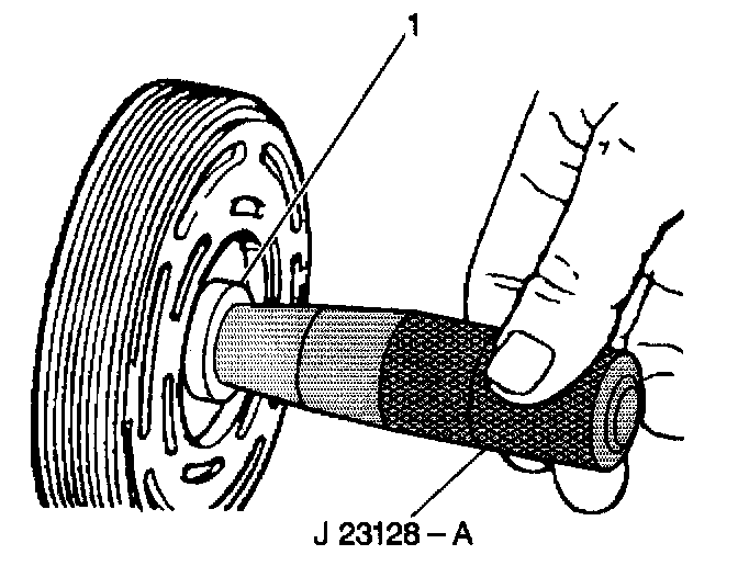 7. Engage the knurled tangs of the J 23128-A with the stamped steel case side of the lip seal (1) in order to ensure that the flared-out side of the lip seal (1) faces toward the compressor.