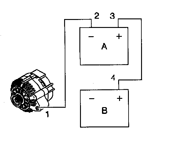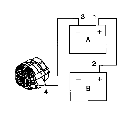 11. The final connection (4) is made to a solid engine Ground (such as the generator mounting bracket), at least 450 mm (18 in) from the discharged battery (B).