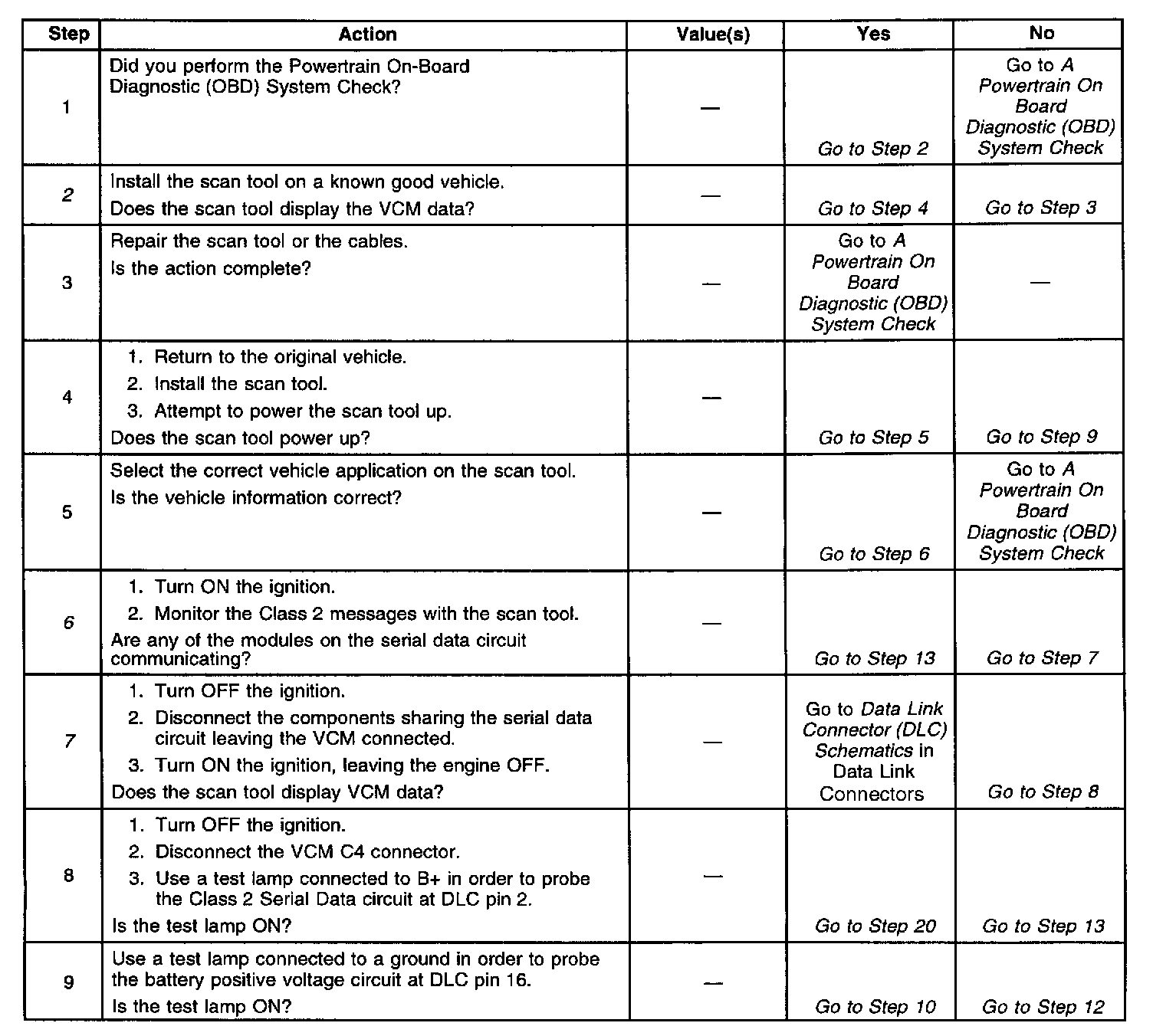 ^ For the VCM to establish communication with the scan tool, the system voltage must be between 9-16 volts. If the system voltage is not within this range. refer to A Diagnostic Starting Point in Starting and Charging. Testing and Inspection