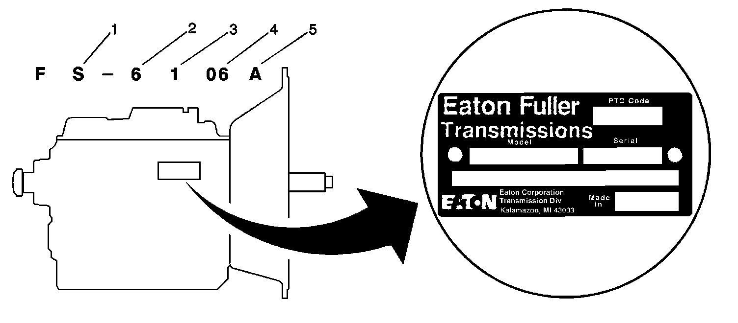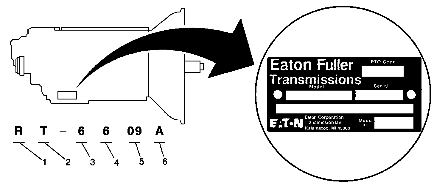 Eaton(R) transmission identification plates are located on the right rear side of the housing, near the top cover.
