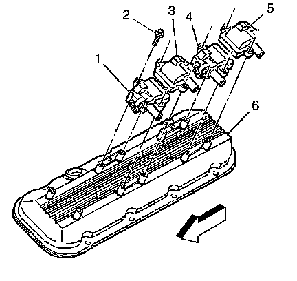 1. Install the coil/module(s) (1,3,4,5) to the valve cover (6).