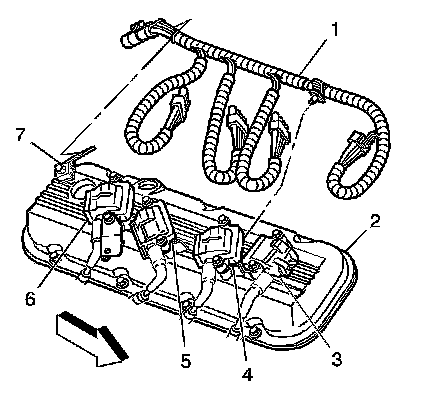 2. Remove the harness connector(s) (1), from the ignition coil/module(s) (2,3,4,5). If removing the harness from the vehicle, remove the bolts from the harness connector (7), to the valve cover (6).