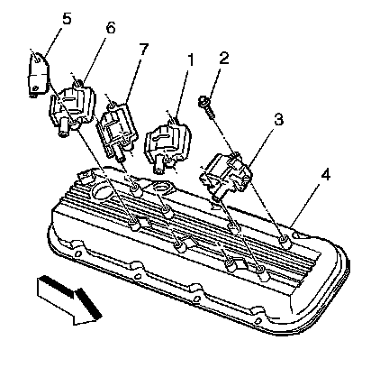 1. Install the ignition coil/module(s) (3,1,7,6) to the valve cover (4). If installing coil/module (6), install the bracket to the Engine Coolant Temperature (ECT) sensor (5).
