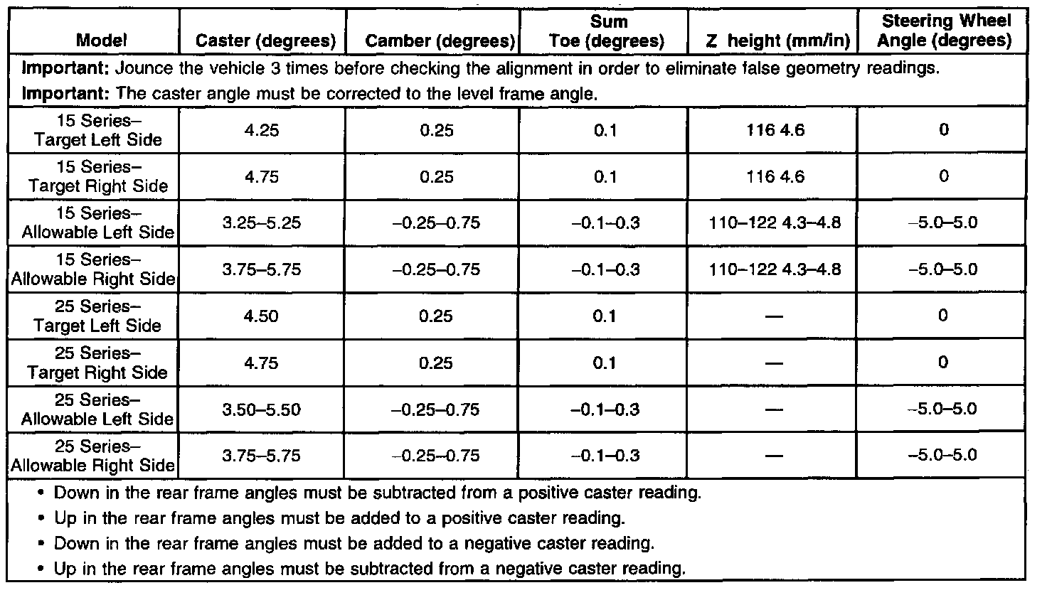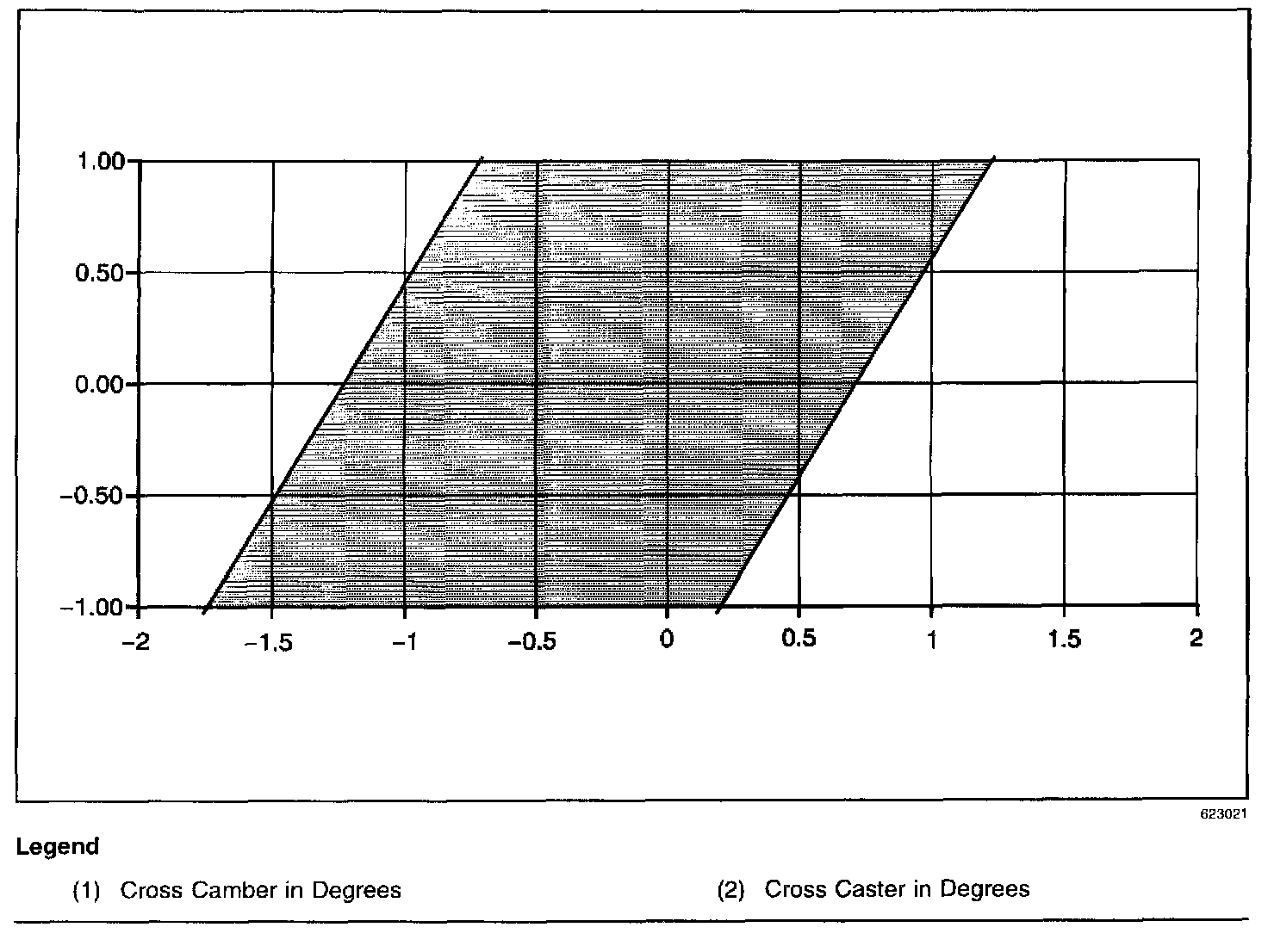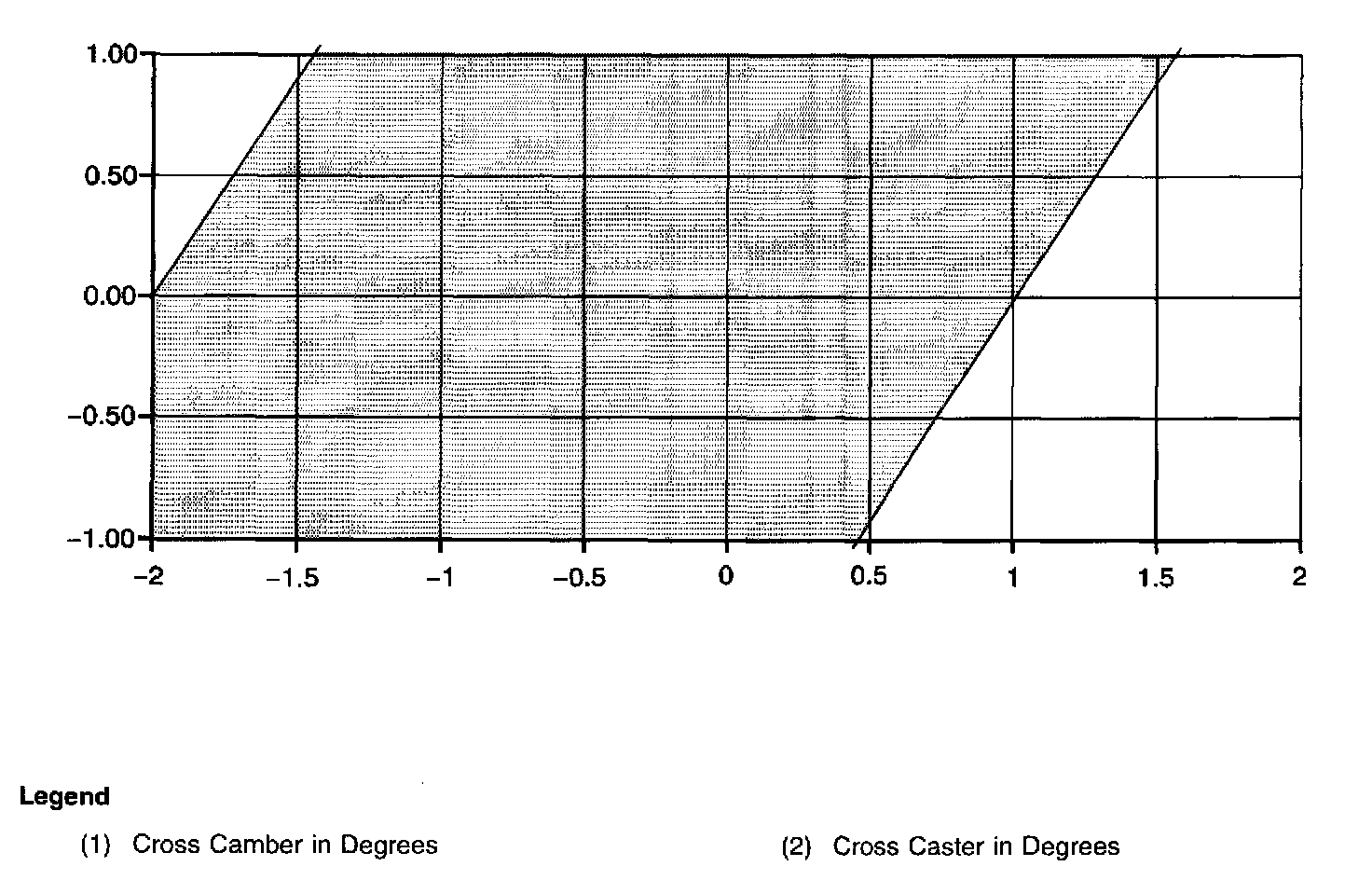Use the cross camber and cross caster figures from your alignment equipment and compare them with the following charts. The shaded areas are within the allowable specification for steering wheel pull.
