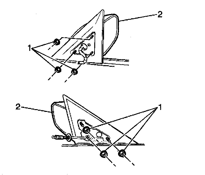 6. Remove outside rearview mirror nuts (1) from mirror assembly (2).