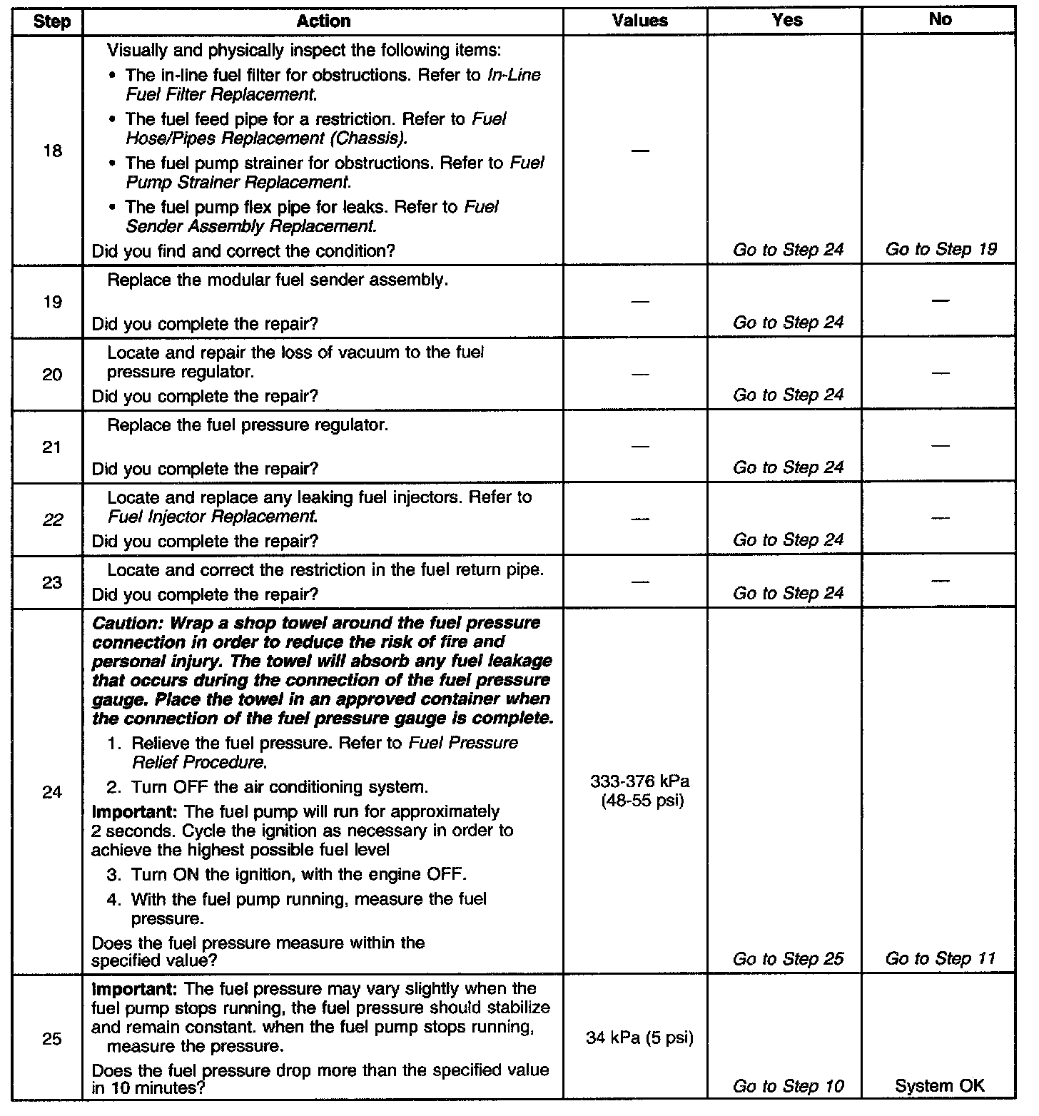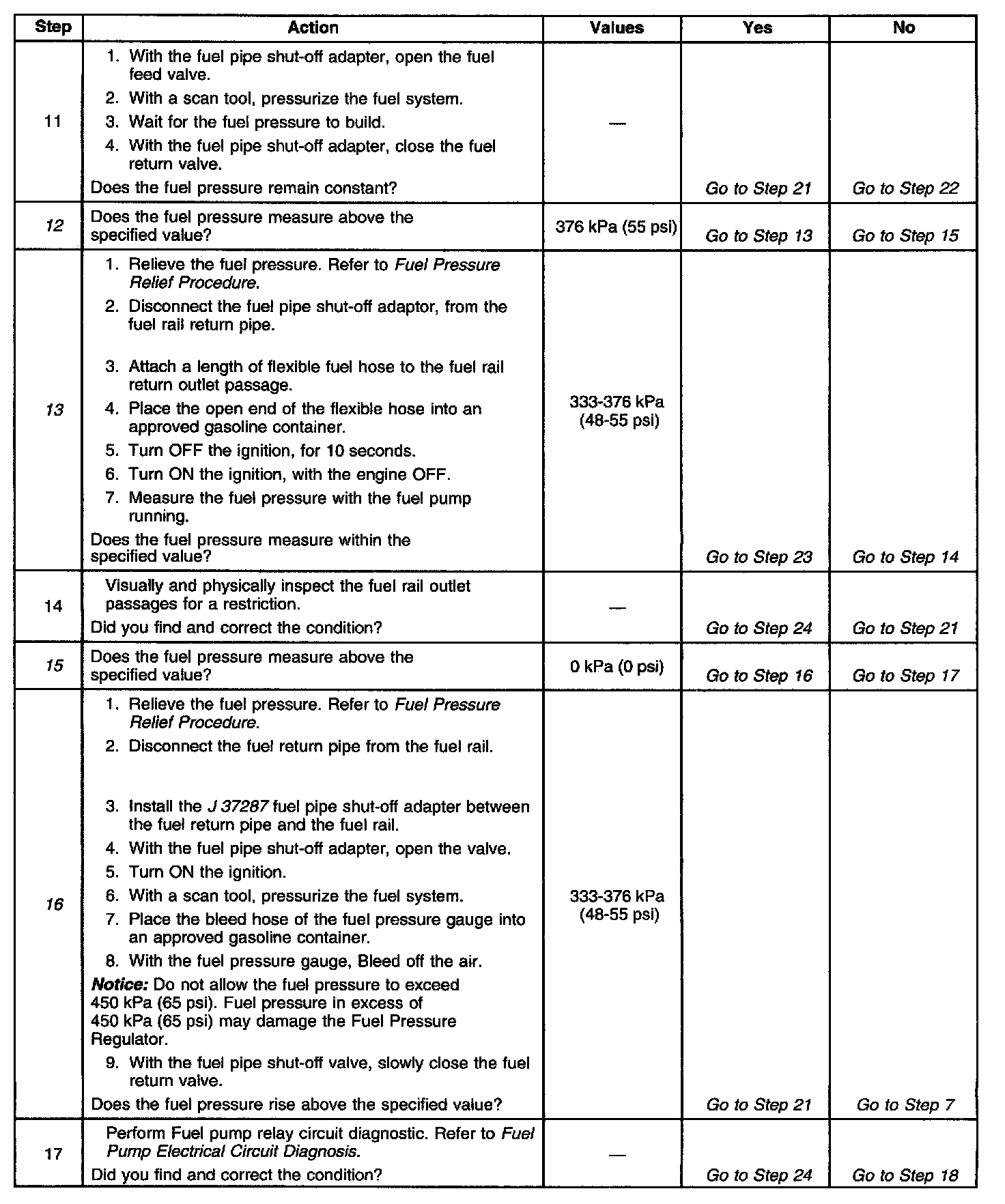 13. This test determines if the high fuel pressure is due to a restricted fuel return pipe or if the high fuel pressure is due to a faulty fuel pressure regulator.