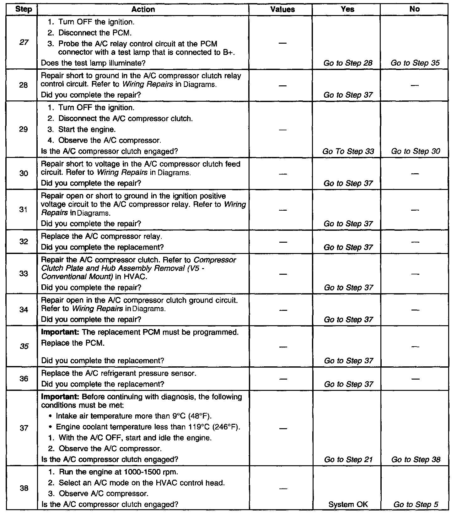 27. Determines if the A/C relay is malfunctioning or the A/C relay control circuit is grounded all the time.