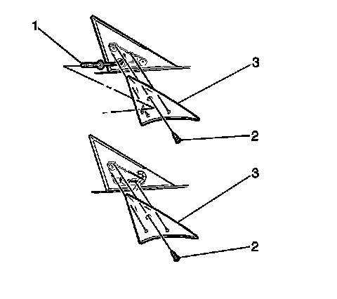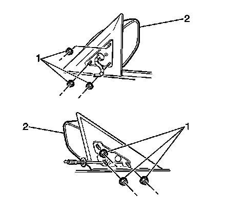 6. Remove the outside rearview mirror nuts (1) from the mirror assembly (2).