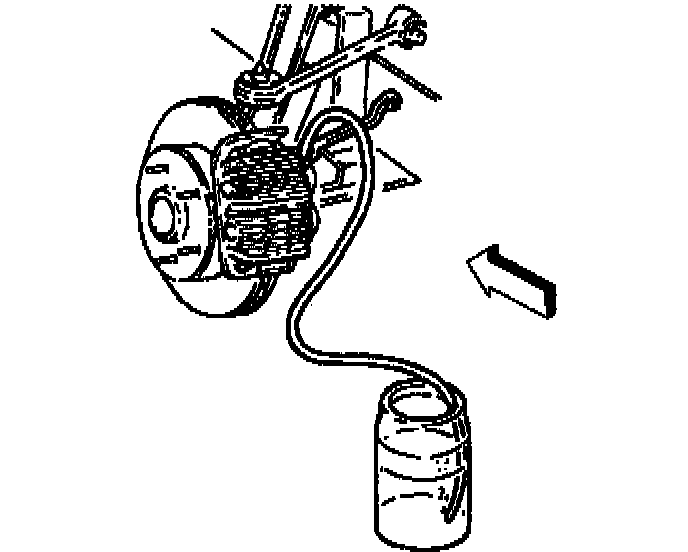 7. Open the brake caliper bleed screw at least three quarters of a turn and allow the brake fluid flow to continue until no air is seen in the brake fluid. Apply intermittent pressure to the brake pedal while pressure bleeding.