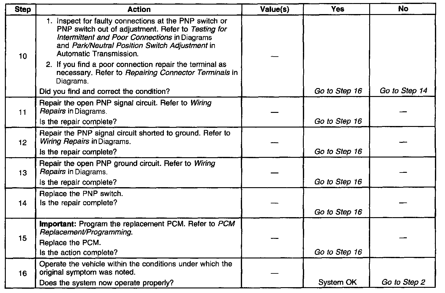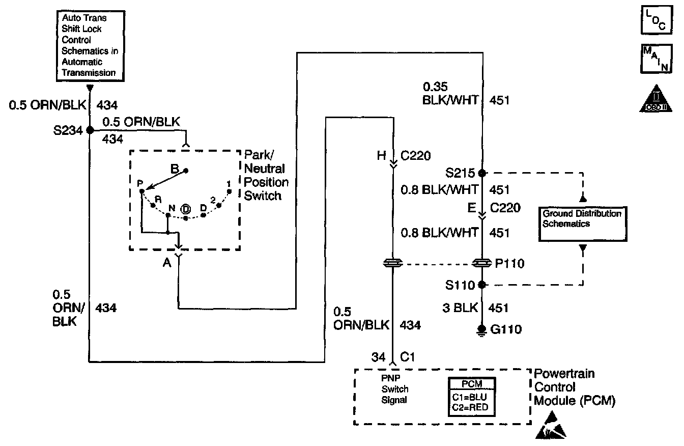The Park/Neutral Position (PNP) switch contacts are closed to ground in park and neutral. The PCM applies a voltage (about 12.0 Volts) to the switch. When the gear selector is in the park or neutral position, the PNP switch is closed and the PCM senses low signal voltage. When the gear selector is in reverse or a drive range, the PNP switch opens, and the PCM senses high signal voltage. The PCM will increase the idle air rate to compensate for the additional load on the engine when the transmission is in gear.