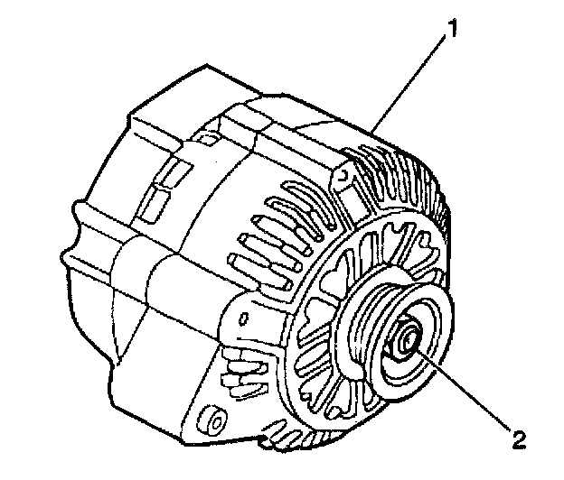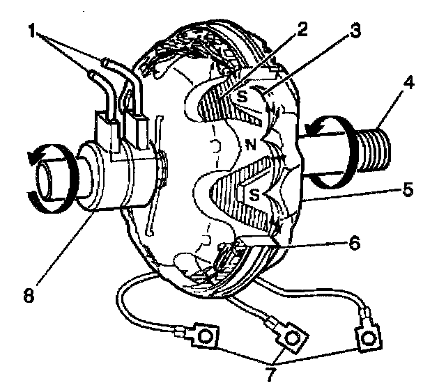 The generator's rotor shaft (2) is rotated by the engine drive belt. The rotor shaft rotates the generator's rotor. The generator produces the electrical current that charges the battery. The generator also provides energy to the vehicle's electrical systems when the engine is running.