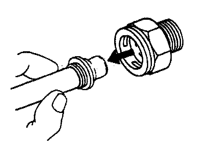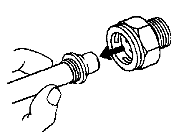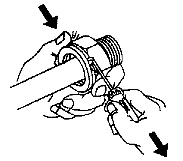 Important: If you cannot position the plastic cap against the fitting, remove the retaining ring from the quick connect fitting per Step 5 of the cooler line removal procedure. Check the retaining ring and the tube end in order to ensure neither is bent. Replace the cooler line or the retaining ring if necessary, and reinstall per Step 2 of the cooler line installation procedure.