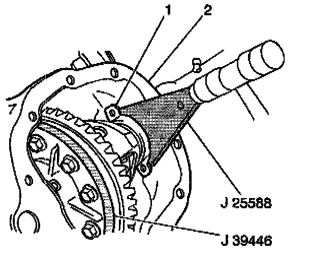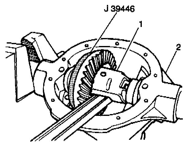 1. Install the differential carrier and the shims (1) into the housing (2) with the shims in the original location with J 25588 and a deadblow hammer.