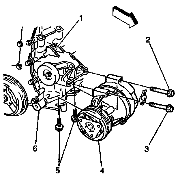 8. Remove the two bolts holding the compressor to the oil pan (5).