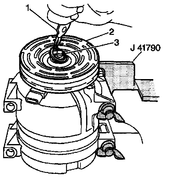 11. Ensure that the clutch rotor and bearing (2) is pressed onto the nose of the compressor far enough to clear the groove for the retaining ring.