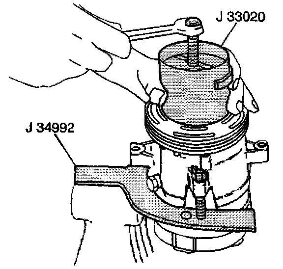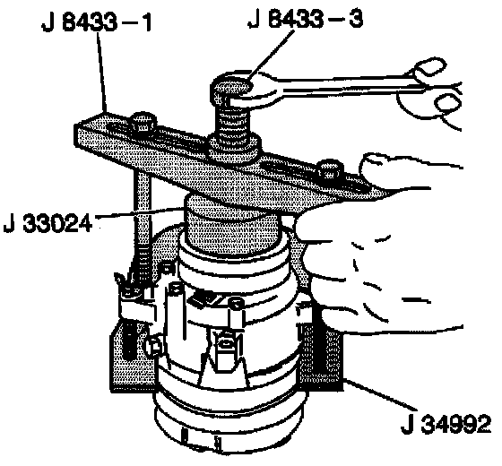 16. Tighten the J 8433-3 in the J 8433-1 in order to force the pulley rotor and bearing assembly onto the front head of the compressor.